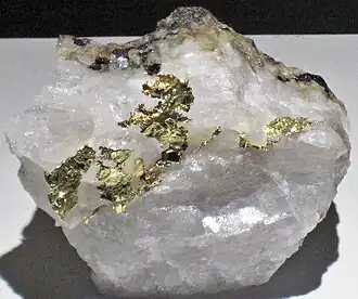 Geochemical studies on gold bearing quartz-carbonate veins are important to determine temperature, pressure, at which the veins were generated, and the chemical signature of fluids. Quartz is generally the dominant mineral in the veins, but there are also gold bearing carbonate dominant veins in orogenic deposits.[15] Ore bodies of orogenic gold deposits are generally defined by ≤ 3–5% sulfide minerals, most commonly arsenopyrite in metasedimentary host rocks and pyrite/pyrrhotite in meta-igneous rocks, and ≤ 5–15% carbonate minerals, such as ankerite, dolomite and calcite.[16] A common characteristic of almost all orogenic gold lodes is the presence of widespread carbonate alteration zones, notably ankerite, ferroan dolomite, siderite and calcite.[17] The tendency of gold to be preferentially transported as a sulfide complex also explain the near absence of base metals (Cu, Pb, Zn) in the same mineral systems, because these metals form complexes with chlor rather than sulfur.[18]