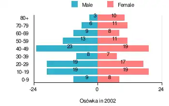 According to the 2002 Poland census, there were 219 people residing in Osówka village, of whom 49.8% were male and 50.2% were female. In the village, the population was spread out, with 20.5% under the age of 18, 37% from 18 to 44, 23.3% from 45 to 64, and 19.2% who were 65 years of age or older.[1]