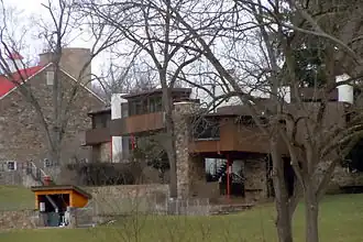 Built in 1938, from the stone walls of an existing stone and frame farmhouse, this historic structure is L-shaped, as was the farmhouse, with frame walls sheathed in cypress. Designed by its owner, architect Oskar Stonorov, it features large window openings, and a flat roof with parapet or thin edge overhang. A guest house was added to the property during the early 1950s.[2]