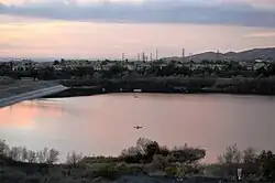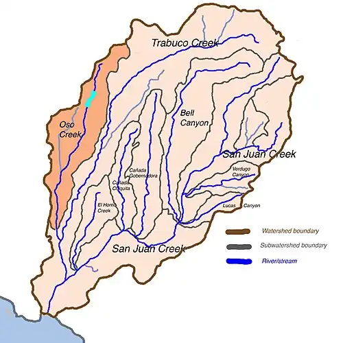 Oso Creek is an approximately 13.5-mile (21.7 km) tributary of Arroyo Trabuco in southern Orange County in the U.S. state of California.[1] Draining about 20 square miles (52 km2) in a region north of the San Joaquin Hills and south of the Santa Ana Mountains, the creek is Trabuco Creek's largest tributary, and is part of the San Juan Creek drainage basin. Beginning in the foothills of the Santa Ana Mountains near the city of Mission Viejo, the creek is dammed twice to form Upper Oso Reservoir and Lake Mission Viejo. The creek is channelized and polluted along much of its length.