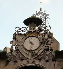 Palazzo del Commendatore (Italian for "Palace of the Knight Commander"), a 16th-century enlargement of the complex, was erected under the pontificate of Pius V and dedicated to Monsignor Bernardino Cirillo, Commendatore from 1556 to 1575, regarded as one of the most famous Commendatori of the institute. The palace overlooks a quadrangular courtyard bordered by a double loggia with arches resting on doric columns in the lower loggia and on ionic columns in the upper one. The ceiling of the lower portico is a ribbed vault, that of the upper portico is wooden; the area of the courtyard houses an impluvium, on the model of the houses in ancient Rome. The central arch of the lower loggia hosts a fountain erected by Paul V as a decoration for the Palace of the Vatican and later moved to the Palazzo del Commendatore by Alexander VII. The upper loggia, in correspondence to the fountain, shows a big clock surrounded by the coat of arms of the family of Cardinal Ludovico Gazzoli. The face of the clock is framed by the figure of a snake touching its own tail, symbol of eternity; on both sides there is a cross with two horizontal axes, symbol of the Holy Spirit.