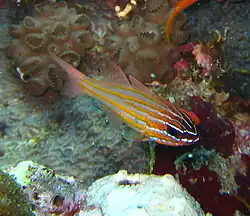 Ostorhinchus cyanosoma, commonly known as the yellow-striped cardinalfish, goldenstriped cardinalfish, or the orange-lined cardinalfish,[1] is a species of marine fish in the cardinalfish family (family Apogonidae) of order Perciformes. It is native to the Indo-West Pacific.
