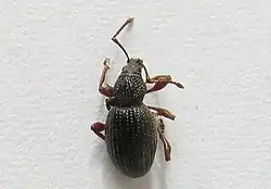Otiorhynchus ovatus, the strawberry root weevil, is one of the many species in the weevil family (Curculionidae), occurring across Canada and the northern United States. The species was first described by Carl Linnaeus in his landmark 1758 10th edition of Systema Naturae. Its name comes from its affinity for strawberry plants, which form a large part of its diet. They are, however, known to feed on other plants as well. Occasionally the larvae cause serious damage to seedlings and young transplants in plantations and nurseries (Rose and Lindquest 1985).[1] It is known to be one of the major pests threatening sub-tropical strawberry farming.