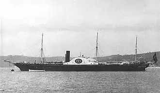 Egypt sent the vessel back to Britain in 1861 to be modernized, and she was rebuilt over the course of the following year at Forrester & Co. in Liverpool.[1] On 31 October 1862, she ran into the British schooner Grace Evans in the River Mersey, severely damaging the schooner.[3] After the work was completed, Ismail Selim Pasha, the Egyptian Minister of Military Affairs, presented the ship to the Ottoman sultan Abdulaziz as a gift. She was then commissioned into the Ottoman Navy and was renamed Sultaniye.[1] The ship carried Mehmed Fuad Pasha on a trip to meet with the Russian Tsar (Emperor) Alexander II in the Crimea in 1867. Sultaniye carried Fuad Pasha to the Livadia Palace, arriving there on 20 August for a meeting that lasted for two days.[4] That year, Abdulaziz embarked on a tour of Western Europe that concluded with a stop in the Austro-Hungarian Empire; there, after meeting with Kaiser Franz Josef I, he boarded Sultaniye in Vienna and then steamed down the Danube to the Black Sea, and then home to the capital at Constantinople. An Austro-Hungarian flotilla of ships, with Franz Josef I aboard one of them, escorted Sultaniye through the river as far as the border with the Ottoman Empire.[5] In 1873, Sultaniye carried Naser al-Din Shah Qajar and his entourage, first on a four-day voyage from Brindisi to Constantinople and some days later, on a three-day voyage from Constantinople to Poti, on their course from Europe to Qajar Persia.[6]