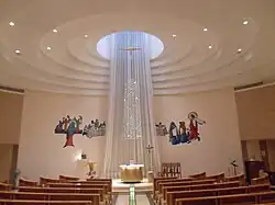 The signature design of the church is a big skylight above the altar, with small sparkling pieces of crystal beads hanging down and a suspended golden cross. On the wall behind the altar, there is a mosaic depicting the scene in the Wedding at Cana by Mexican artist, Francisco Borboa.[5] There are also flowing water running from the altar to the baptismal font at the entrance of the church.[4]