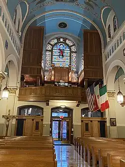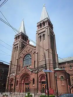 Membership within the church exceeded predictions and the need for a third church building resulted in the construction of the current building in 1909.[16][17] In 1910 a second school was constructed from a part of the former church building.[18] A year later Paul Peter Rhode, the first Polish bishop in the United States, came from Chicago to bless the new church.[19] Twice the church caught on fire, on December 12, 1912,[20] and on May 30, 1915,[21] The amortization of debt in 1917 preceded its consecration by John J. O'Connor (bishop of Newark) in that year.[22]