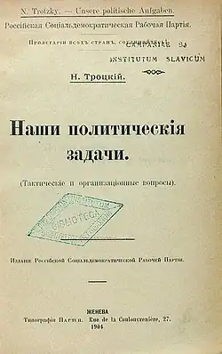 Our Political Tasks (Russian: Наши политические задачи) is a pamphlet by Leon Trotsky, published in 1904 as a response to the book of Vladimir Lenin "One Step Forward, Two Steps Back". It is the first relatively large work of the author; the book was aimed against the RSDLP party split, in which Lenin was accused.