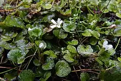 Ourisia modesta is unique among all other New Zealand mountain foxglove species in its very small size, mostly hairless aspect, opposite, and very broadly ovate to circular leaves that are widely separated along a creeping stem.[5] Furthermore, its flowers are solitary in each node, and inflorescences only have one or two flowering nodes.[5] The flowers have irregular calyces and irregular corollas that are very small (less than 9 mm long). Inside each corolla is one line of hairs plus a ring of hairs near the corolla tube opening.[5]