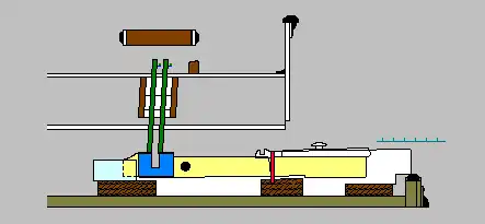 For the keys that play the near row of jacks (closer to the player), the mechanism works like this. The portion of the key that engages the lower end of the jack is U-shaped, with each prong of the U ending in a wide, flat upper surface. (This U-shaped part is shown in blue in the false-color diagrams below.) The entire keyboard mechanism can be slightly shifted toward or away from the player, using knobs at the sides of the keyboard. Depending on the location of the keyboard, the jacks will be aligned in different ways against the U, resulting in different strings being played. The three possibilities are shown in the diagrams below, which depict sounding jacks in green, silent ones in red.