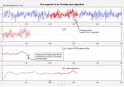 The concept is to compute short segments of y[n] of an arbitrary length L, and concatenate the segments together. That requires longer input segments that overlap the next input segment. The overlapped data gets "saved" and used a second time.[1] First we describe that process with just conventional convolution for each output segment. Then we describe how to replace that convolution with a more efficient method.