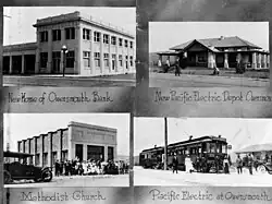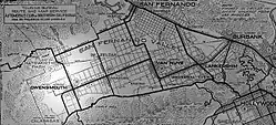 The town was started by the Los Angeles Suburban Homes Company as part of an extraordinary real estate development in Southern California.[1] Los Angeles Suburban Homes Company was owned by a syndicate of rich Los Angeles investors, developers, and speculators: including Harrison Gray Otis, Harry Chandler, Moses Sherman, Hobart Johnstone Whitley, and others.[2] On April 2, 1915, H. J. Whitley purchased the Suburban Home Company so that he would have complete control for finishing the development.[3] It anticipated possible connections to but was planned independent of the soon to be completed (1913) Los Angeles Aqueduct from the Owens River watershed to the City of Los Angeles through the San Fernando Valley in Los Angeles County.The newly built Sherman Way double drive and the Pacific Electric street cars, opened on December 7, 1912, gave new access to the town and to the other new towns in the valley Van Nuys (1911) and Marion (now Reseda); At the time the new road and streetcar seemed like route to an open agricultural fields at the end of the line — but was a necessity to promote development. Sherman Way was a paved boulevard with lush landscaping and no speed limit where one might get up to 35 mph, there was a separate dirt road for farm wagons/equipment, and telegraph lines.[2]