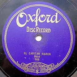 In 1906, Sears introduced the Oxford disc to replace the earlier Harvard brand.[1] These discs in the 11000 and 16000 series, were produced by Leeds & Catlin.[1] The 1908 Sears catalog introduced 7-inch discs listed at 21 cents that were pressed by Columbia and numbered in the 7000 series.[1] In 1909 10-inch discs from Zonophone, retailing at 30 cents, were introduced.[1] Fall 1911 saw Sears return to Columbia for pressings.[3] These later discs are the most commonly found.[1] The brand was phased out in 1916 for the new Silvertone brand,[1] although records with the Oxford label were still being shipped in late 1917.[3] Recordings appearing on the Oxford label could be recorded anywhere from 1901 to 1916.[4] The take number is important to dating the recording, particularly for Columbia pressings. Cal Stewart's "I'm Old But I'm Awfully Tough" (Oxford 22)[4] first appeared on Columbia in 1901, but the issued take number of was probably recorded much later.[3]