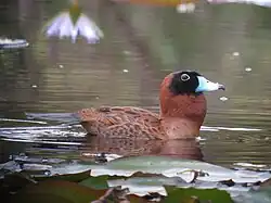 The musk ducks (Biziura), sometimes included in this group, are noted for their bizarre habitus and pronounced sexual dimorphism; they are of uncertain position and decidedly aberrant. Their anatomy is more similar to Oxyura than to the two less derived genera, but still unique in many respects. mtDNA cytochrome b sequence data suggest a closer relationship with the pink-eared ducks (Malacorhynchus) which if correct would represent one of the most drastic cases of divergent adaptation in the whole Anseriformes.[1][2]