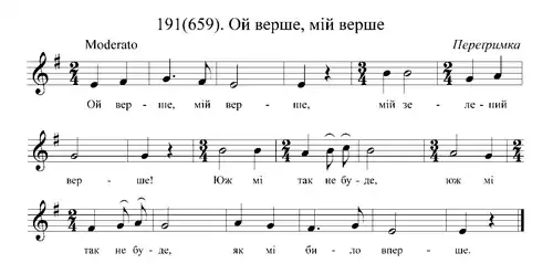 - ^ "Нотний запис Ой верше мій верше (Аранжування Д.Кацала)".