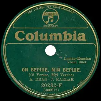 In 1928, a 78 rpm record was released in New York City on the Columbia label, containing two Lemko songs. On the first side – "Za Horamy, za Lisamy" (Beyond the Mountains, beyond the Woods), and on the second – "Oi Versze, Myi Vershe" performed by a duet of New York Cathedral Choir members Anna Dran and Joanna Karlyak with orchestral accompaniment. In fact, almost all subsequent solo performances of the song used the same words. However, there is a significant diversity in both the text and the melody and rhythm in folklore and musical notations.