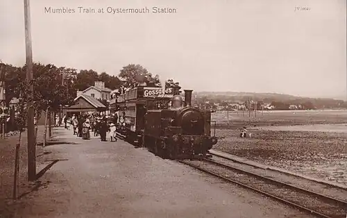 The station was opened on 25 March 1807 by the Oystermouth Railway. The first services were horse drawn. Due to an increase in road traffic competition, the fares were reduced in 1826. The station closed in 1827 after the horse drawn services ended.[1] It reopened on 11 November 1860 as Mumbles. It was resited 50 yards to the south on 6 May 1893 but the old station continued to be used. The old site was known as Elms. This site closed after December 1895. The station's name was changed to Oystermouth on 2 November 1895. It closed along with the line on 6 January 1960.[2][3] The ticket office is still in use as a café.[4]