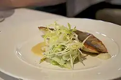 The menu at Pétrus is split into several fixed price menus,[7] containing modern French cuisine.[8] It has been described by Zoe Williams as being distinctly Gordon Ramsay in composition, despite the influences of head chef Sean Burbidge.[9] The meals come with an amuse-bouche, a pre-starter course, and after dinner chocolates in addition to the items listed on the menus themselves.[10] A number of pan fried fish dishes have been on the menu, including mackerel with tomato chutney and a niçoise salad, and a sea bream course served with brown shrimp, samphire and an oyster velouté sauce.[9] Further seafood related dishes include a langoustine and watercress soup entrée which was praised by food critic Jay Rayner.[11] Sauces are generally delivered to the table in small jugs and are poured tableside.[10]