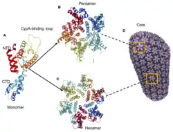 - ^ Gitti RK, Lee BM, Walker J, Summers MF, Yoo S, Sundquist WI (July 1996). "Structure of the amino-terminal core domain of the HIV-1 capsid protein". Science. 273 (5272): 231–235. Bibcode:1996Sci...273..231G. doi:10.1126/science.273.5272.231. PMID 8662505. S2CID 5960953.