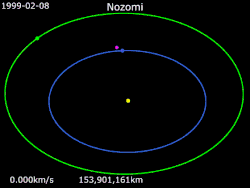 It flew by Earth on December 20, 1998, at a perigee of about 1000 km. The gravitational assist from the flyby coupled with a 7 minute burn of the bipropellant rocket put Nozomi into an escape trajectory towards Mars. It was scheduled to arrive at Mars on October 11, 1999, at 7:45:14 UT, but a malfunctioning valve during the Earth swingby resulted in a loss of fuel and left the spacecraft with insufficient acceleration to reach its planned trajectory. Two course correction burns on December 21 used more propellant than planned, leaving the spacecraft short of fuel.[2]