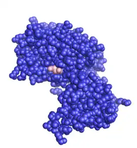 The structure of the core of PTEN (solved by X-ray crystallography, see figure[5]) reveals that it consists primarily of a phosphatase domain and a C2 domain. The phosphatase domain contains the active site, which carries out the enzymatic function of the protein, while the C2 domain binds the phospholipid membrane. Thus PTEN binds the membrane through both its phosphatase and C2 domains, bringing the active site to the membrane-bound PIP3 to dephosphorylate it.