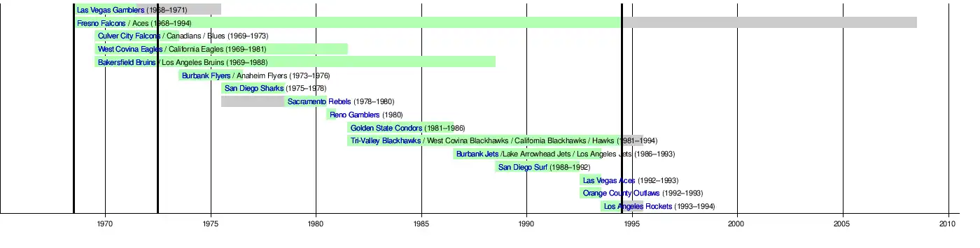 A PSHL season ranged from 15 to 30 games each between anywhere from 4 to 8 teams. Franchises shifted frequently, often with new teams appearing the next season from the same cities. The mainstays of the league were the Fresno Falcons, the Los Angeles Bruins and later in the league's history, the Burbank or Los Angeles Jets and the West Covina or California Blackhawks (later just Hawks).