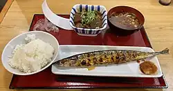 Saury is one of the most prominent seasonal foods representing autumn in Japanese cuisine. It is most commonly served salted and grilled (broiled) whole, garnished with daikon oroshi (grated daikon) and served alongside a bowl of rice and a bowl of miso soup. Other condiments may include soy sauce, sudachi, lime, lemon, or other citrus juices. The intestines are bitter, but many people choose not to gut the fish, as many say its bitterness, balanced by the condiments, is part of the enjoyment.