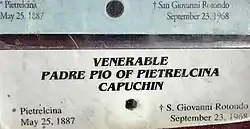 Pio of Pietrelcina (born Francesco Forgione; 25 May 1887 – 23 September 1968), widely known as Padre Pio (Italian for 'Father Pius'), Latin: Pater Pius, was an Italian Capuchin friar, priest, stigmatist, and mystic. He is venerated as a saint in the Catholic Church, celebrated on 23 September.[2]