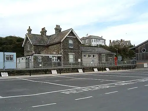 Upon its opening the station consisted of a single platform 100 yards (91 m) in length, a run-around loop, a siding leading down to a fish shed and platform by the harbour where fish consignments were loaded, and a small goods shed on the Down side with canopies over the loading points on each side. The station incorporated the stationmaster's residence and was constructed of local stone. A platform canopy decorated with saw-tooth valancing was also added. Finally, a stone 18-lever signal box was situated near the platform. The first changes occurred in 1900 when a turntable was installed. Around 1910 a carriage siding was added to next to the run-round loop, followed by the construction of the South Jetty served by two long sidings.[4]