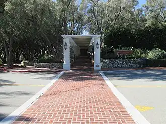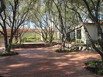 Padua Hills was a 2,000-acre tract of land directed by Bess Garner and Herman Garner. It was subdivided into a 6-acre artist colony called the Little Theater Association with a central dining room, artist studio, shops, and a small theatre. Located three miles north of Foothill Boulevard in the City of Claremont, the Spanish Revival buildings were nestled at the base of the mountains and surrounded by lush trees and shrubs. As described by the National Register of Historic Places, "The complex is situated on six acres of land and includes three buildings--a theater and restaurant building, an adjacent apartment, and a studio/residence--grouped around a central courtyard. The landscaping of olive trees and rock walls and curbing, along with an outdoor stage structure are contributing site features. A 'Padua Hills Theatre' sign with a pair of Mexican folk dancers and a life-sized statue of an Indian maiden add to the mood of the setting."[3] The theatre was operated by the Padua Institute, a non-profit educational corporation. Offering courses in Mexican folk music, dance, and Spanish, the institute was advertised for its work in preserving the Spanish and Mexican heritage of early California.[4]