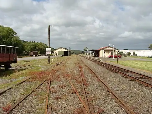 Pahiatua railway station is on the Wairarapa Line in New Zealand's North Island. It was opened in May 1897, shortly before the line was opened to Woodville in December of that year. The station is located in Mangamutu, 1.7 kilometres (1.1 mi) west of Pahiatua, in contrast to the original plans for the railway line to run through the town.