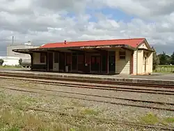 The original station building was the standard ("Special") Class 2 design using wood and corrugated iron as building materials, as was common for stations serving towns similar to Pahiatua at the time.[5] Facilities included a station building, platform, "cart-road to passenger platform", a 60-by-30-foot (18.3 by 9.1 m) goods shed, a loading bank, a crane, and cattle yards. The station building contained a ticket office and counter, a waiting room, a station master's office, general staff office and amenities, and public amenities. A stationmaster's house was also provided. A platform veranda was constructed in September 1900, and telegraph facilities were added in 1912.