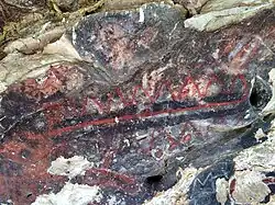 The interior of the rock alcove is adorned with many pictographs created by the Chumash, Salinan and Yokuts peoples over many thousands of years. In recent times there have been many marks left by early White settlers such as one reading "Geo. Lewis 1908", founder of Atascadero, California. Unfortunately there has also been major defacing of this site; in the 1920s the large pictogram was irreparably damaged by a shotgun blast.