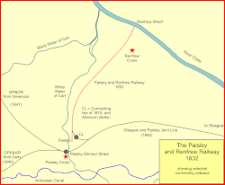Paisley was an important Burgh at the beginning of the nineteenth century, and most passenger and goods journeys involved a passage along the River Clyde followed by the tedious and slow negotiation of the River Cart. This was such an obstruction that local promoters decided to construct a railway between Renfrew Wharf and the centre of Paisley. They employed the engineers Thomas Grainger and John Miller, who had successfully designed several coal lines in the West of Scotland and elsewhere. The line was authorised by the Paisley and Renfrew Railway Act 1835 (5 & 6 Will. 4. c. lxxxv) on 21 July 1835.[2][3]
