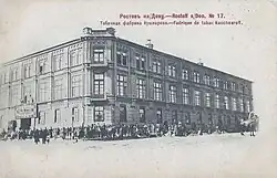 The three-story building in Rostov-on-Don at the corner of present-day Budennovsky Avenue and Pushkinskaya Street was built in the 1880s for the needs of Kushnaryov Tobacco Factory. In 1914 the "Ya. S. Kushnaryov Partnership" together with Aslanidi Tobacco Factory joins merged with Asmolov Tobacco Factory Enterprise, and so the building on Budennovsky Avenue was rebuilt in 1914-1915 in the Empire architectural style on the project of the Armenian architect Arutyun Khristoforovich Zakiev.[1]