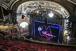 The proscenium arch measures 44 feet (13 m) across.[15][16] It contains pellet, egg-and-dart, and acanthus-leaf moldings surrounding a band of acanthus leaves. The top of the arch consists of a keystone with a molding of a child's head.[56] A sounding board rises above the proscenium arch, with foliate bands at the perimeter. At the center of the sounding board, above the stage, is a circular panel depicting a lyre.[55] The orchestra pit is at the front of the orchestra seating level, in front of the proscenium. It dates from a 1965 renovation and contains high walls.[55] The stage is behind the proscenium arch and orchestra pit.[54] The stage historically had a Wurlitzer Opus 303 organ.[3][61] The orchestra and stage both have stage lifts.[42][62]