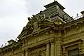 The triangular pediment on central rustication cornice is expressed with heraldic elements and sculpture figures. Architect Nicholas von der Nonne, in his original form, tried to mark the central part with a vivid artistic form, and decorated the form with a decorative dome on it. Vividly profiled cornice with sophisticated architectural detail differs in volume-spatial composition of the building.[8]