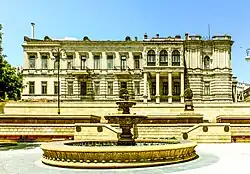 Facade on the side of Niyazi street and specially mentioned and not deep avant-corps which has three axis are divided into two floors with stylobates which are profiled through the whole corps. The central axis is striking with small dome as well. The whole composition of the façade is enriched with lightweight loggia-porticoes of the Ionic order, which is particularly noticeable. This method led to the creation of a composition with landscape. The classic forms of the columns of the visible portico, corinthian order of the avant-corps, the profiles of window frames, and construction of first floor from deep and second floor of lightweight stones creates plastic composition.[7] The palace has unique properties for buildings similar to other building in Baku. In the 1930s, the reconstruction of the land was completed. The volume of the palace was included in the reconstructed garden composition by architect K. İ. Senchikov, which created a whole ensemble.[11]