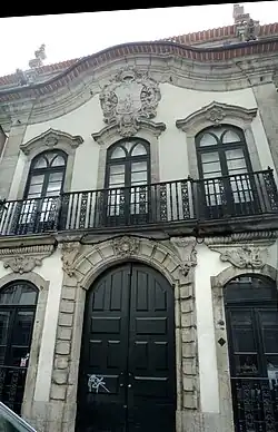 The building is flanked by a three- and two-storey building, located with a long narrow area between the Rua de Belomonte and Rua do Comércio do Porto., near the Palace of São João Novo.[1] The long symmetrical, rectangular Baroque manorhouse is marked by a two-storey frontispiece and Mansard roof, with undulating cornices and sculpted granite stone.[1]