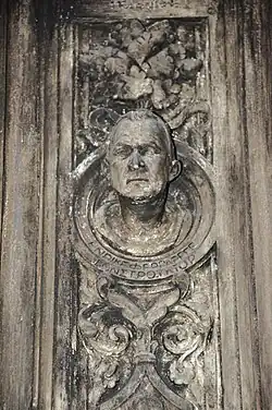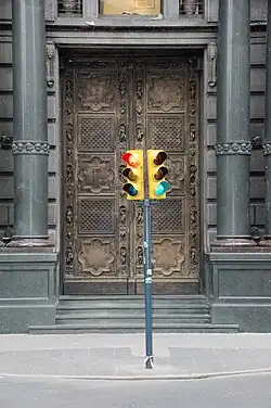 The front gates, centered on the southwest corner of the intersection, were made of electrolytic bronze in Greece and consist of a twin set of five paneled vertical sides 3 meters wide by 5 meters high. The door was designed by Manuel Ocampo, inspired by the 14th Century Porta del Paradiso at the Baptistry of San Giovanni in Florence, Italy. Following the Gothic tradition, the door features chiseled bronze busts of the Fuentes, Durand, and Ferrarese. Other reliefs in the gates represent the Seasons, the Four Cardinals, the Muses and the Native Argentine. The central panels bear the monogram of the proprietor, Juan Fuentes. All the inscriptions are in Greek. The other doors on the ground floor have reliefs of the faces of former presidents of Argentina Nicolás Avellaneda and Julio Argentino Roca.[5][6]