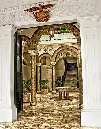 The Palacio de las Garzas is a colonial-style building. Following the restoration after the 1951 coup d'état, much of its original structure was recovered — including numerous bullet holes that remain visible as historical marks.
