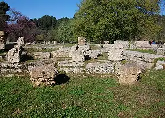 - ^ The building was one of the first uncovered in 1876. By 1892, the publication by Friedrich Adler, Richard Borrmann, and Wilhelm Dörpfeld of Die Baudenkmäler von Olympia identifies the building, tying it to Pausanias 6.21.2. Emme 2018, p. 144