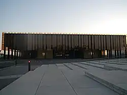 Even prior to completion of the third annex, in October 1988 the Council of the then European Communities authorised the need for a fourth extension, recognising the need for office space to cope with an increasing workflow and the future demands of additional staff caused by future possible enlargements.[6] In 1996, this task was awarded to Paris-based architect Dominique Perrault following an architectural competition. The existence of asbestos in the Ancien Palais building, as well as outdated office arrangements in a building designed prior to the incorporation of modern IT services would require the gutting of the internals of the existing structures. Asbestos removal work began in 2000, with a ground-breaking ceremony held in 2002, and construction works on the fourth extension only beginning in earnest in 2004, and lasting until 2008, with the inauguration ceremony occurring on 4 December of that year.[7][8] Subsequent renovation works on the three annex buildings also occurred.