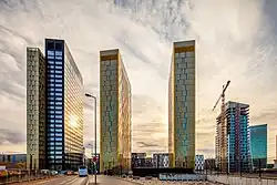 Also designed by Perrault, the fifth and most recent extension to the Palais complex was inaugurated on 19 September 2019, consisting of a third high-rise, known as the Rocca tower, providing for additional office space for the CJEU's translation services and administration.[20] Standing parallel to — but at a slight angle from — the Comenius and Montesquieu towers, this addition to the complex was planned during the fourth extension to take place at a later date. The 29 storey, 118 m tall tower is the tallest structure in Luxembourg, taking over from the prior record holders, the Palais' complex's Comenius and Montesquieu towers.[21][16] The Rocca tower is composed of two structures, adjoining and offset, with the shorter structure, having the same profile and height as the Comenius and Montesquieu towers, featuring the same anodized aluminium golden-coloured façade, and the taller structure featuring a contrasting black façade.[22] Its 27th floor features an observation deck, which it is claimed by the CJEU, is the only one of its kind on Earth offering a view of four countries; Belgium, France, Germany and Luxembourg.[23]