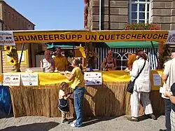 During plum season a common main dish is "Grumbeersupp und Quetschekuche" which is potato soup and plum cake and for dessert Kerscheplotzer is served. Another seasonal dish is Zwiebelkuchen which is commonly served with Federweisser in autumn.