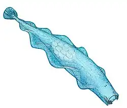 An ecdysozoan worm considered close to the priapulids, it has a spiny proboscis, an elliptical theca on the posterior part of the trunk, and a caudal appendage. |