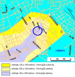 The circled area comprises 9 hectares and is crossed by the stream (arroyo) Cancela starting at Osvaldo Aranha Street and flowing toward Fernando Ferrari Avenue. Along this stretch Triassic vertebrate fossils are found within the exposed red sediments. The main collection points are listed as 1, 2 and 3 in Figure 2. The distance from point 1 to point 3 is 185 meters, whereas the distance from point 3 to Otavio Alves de Oliveira Street is 142 meters.