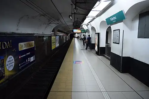 Palermo is a station on Line D of the Buenos Aires Underground in Palermo, Buenos Aires. It is located at the intersection of Avenida Santa Fe and Godoy Cruz.[1] The station was opened on 23 February 1940 as the western terminus of the extension of Line D from Tribunales. On 29 December 1987, the line was extended to Ministro Carranza.[2]