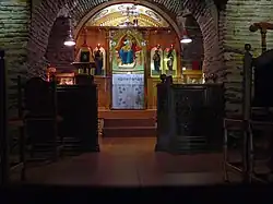 The temple used to have many murals, but it was covered with layers of mortar for years. On the eastern pediment of the central aisle the Ascension of Christ is depicted, and on the western pediment the Pentecost, which only surfaced when the wooden ceiling, dating to Ottoman period, was removed.[16] Those murals have been dated to the second halve or last quarter of the 14th century, during the Palaeologan Renaissance.[17]