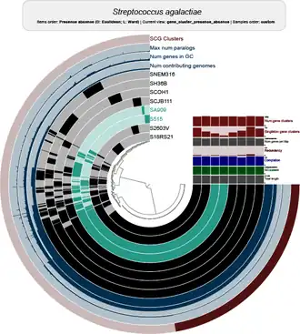- ^ a b c d e f g h i j k l Tettelin H, Masignani V, Cieslewicz MJ, Donati C, Medini D, Ward NL, Angiuoli SV, Crabtree J, Jones AL, Durkin AS, DeBoy RT (2005-09-27). "Genome analysis of multiple pathogenic isolates of Streptococcus agalactiae: Implications for the microbial "pan-genome"". Proceedings of the National Academy of Sciences. 102 (39): 13950–13955. Bibcode:2005PNAS..10213950T. doi:10.1073/pnas.0506758102. ISSN 0027-8424. PMC 1216834. PMID 16172379.