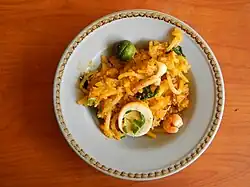 Pancit Malabon is a Filipino dish that is a type of pancit which originates from Malabon, Metro Manila, Philippines. It uses thick rice noodles. Its sauce has a yellow-orange hue, attributable to achuete (annatto seeds), shrimp broth, and flavor seasoned with patis (fish sauce for a complex umami flavor) and taba ng talangka (crab fat). Local fresh seafood toppings may include cooked shrimp, squid, smoked bangus (milkfish), mussels, and/or oysters. Other optional garnishes can include pork, hard-boiled duck/hen eggs, crushed chicharrón (pork rinds), chopped green onions, lightly browned sautéed minced garlic, and spritz of calamansi juice.[1][2]